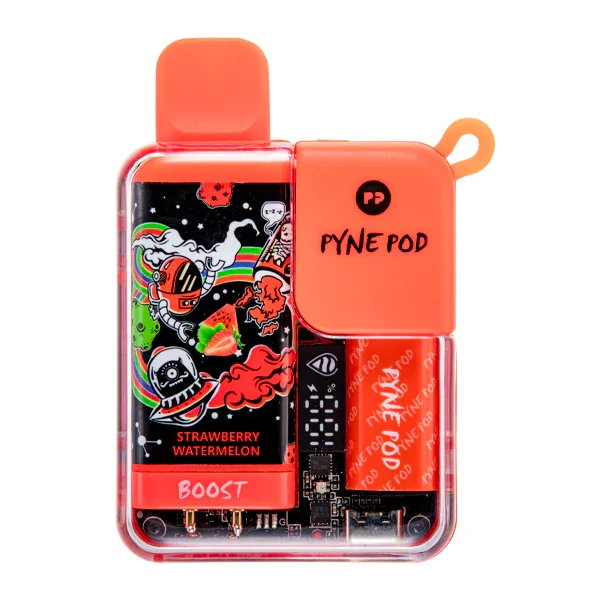 PYNE POD BOOST 8500 DISPOSABLE VAPE 5-PACK Flavor : A juicy combination of strawberry and watermelon flavors makes for a refreshing vape that captures the spirit of summer. E-liquid contents : 10ml Nicotine Level : 50mg Puffs per Device : Up to 8500 puffs Battery : 550mAh (Rechargeable via USB-C) Master Case Qty : 200 Battery & Liquid Display Flavor Boost Mechanism Features Dual Coils Browse more disposable vape flavors