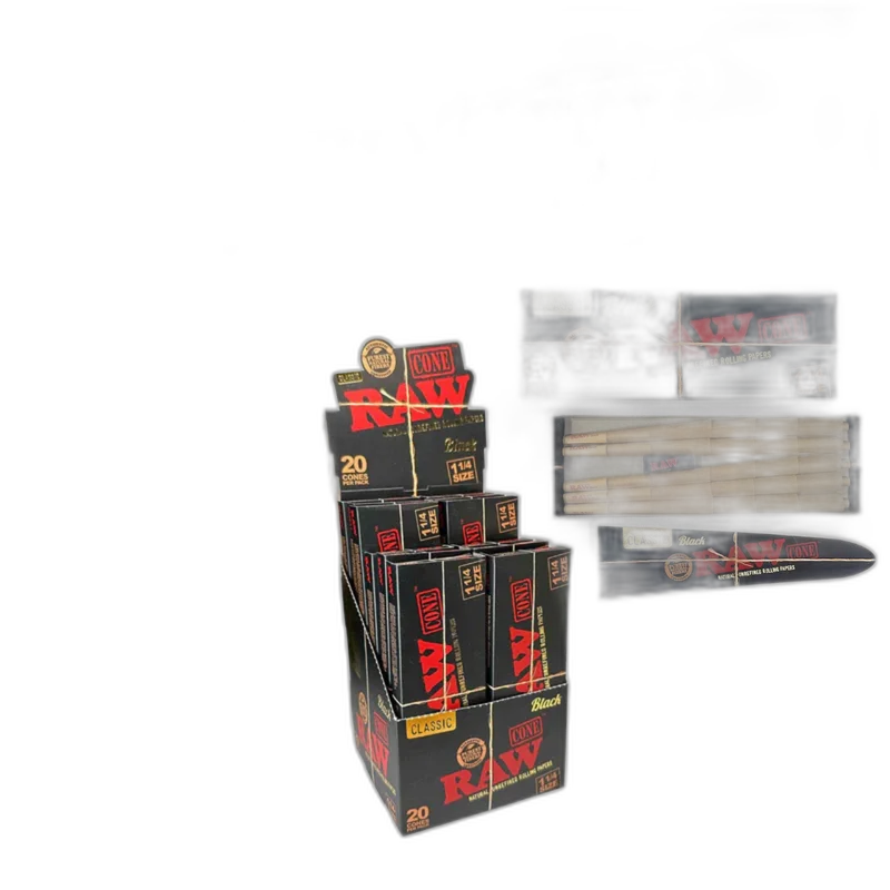RAW BLACK CLASSIC CONES 1-1/4 DISPLAY OF 12 (20PK) (RAW-165) — RAW's premium cone designed for the discerning smoker. Crafted with quality materials for a clean taste and consistent burn rate. This 4 DISPLAY package offers great value for stocking retail shelves or personal use. Available at wholesale from Port City Wholesale.