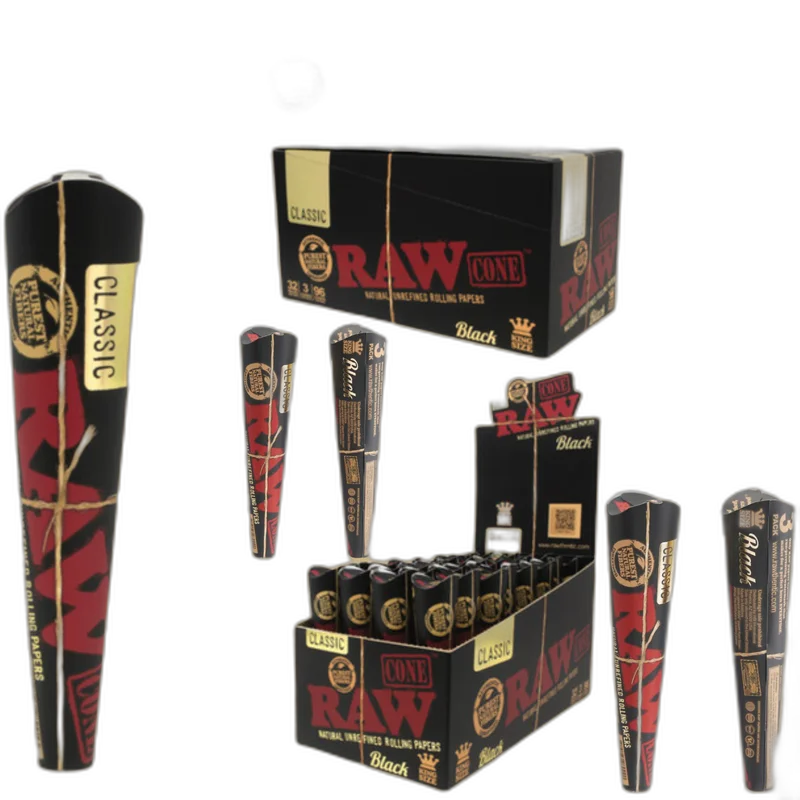 RAW BLACK CLASSIC KING SIZE CONE DISPLAY OF 32/3PK (RAW-147) — RAW's premium cone designed for the discerning smoker. Crafted with quality materials for a clean taste and consistent burn rate. This 3PK package offers great value for stocking retail shelves or personal use. Available at wholesale from Port City Wholesale.