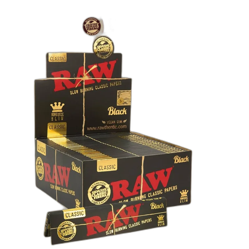 RAW - BLACK KING SIZE SLIM ROLLING PAPERS 32CT- DISPLAY OF 50 RAW Black Kingsize Slim are designed for the highest end smokers who prefer a longer smoke. This unique artisan paper is produced in the Alcoy region of Spain where the dry Valencian winds make humidity optimally low. RAW Black 1 is so thin that it allows you to truly taste your terps RAW Black was created for a new generation as the next level of top shelf smoking materials. 32 Papers per Pack 50 packs per Box