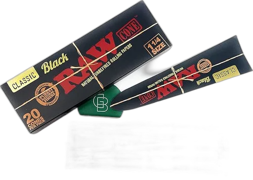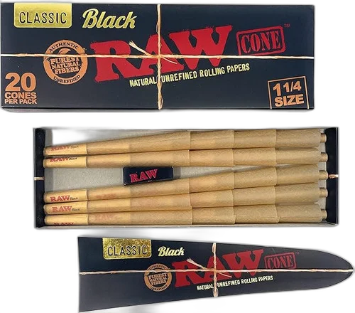 Black Pre-Roll Cone 1 1-4 (20ct) w/ Funnel - 12 Pack Display by RAW. Premium pre-rolls made with quality flower for a smooth, even burn. Each one is carefully packed for consistent draw and potency throughout. Suggested retail: $8.99.