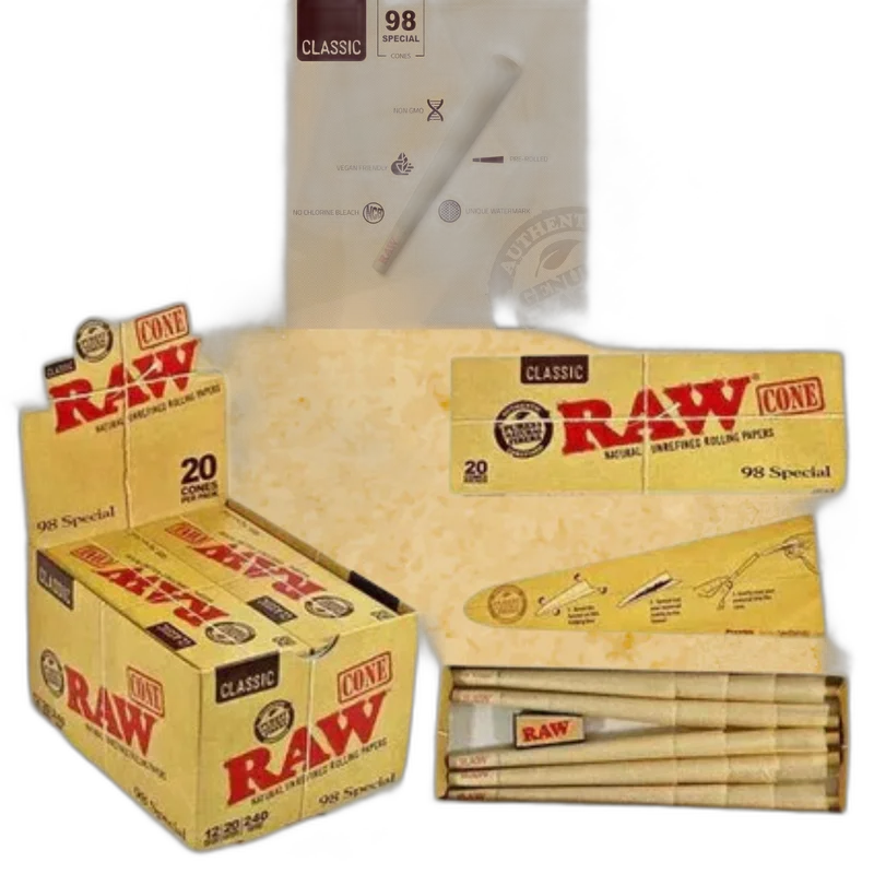 RAW - CLASSIC 98 SPECIALS CONES 20 PER PACK DISPLAY OF 12 The RAW Classic 98 Special Cone are kinda in between a 1¼ and King Size cone. It is 98mm long so it’s longer than a 1¼ cone yet shorter than a Kingsize, but about as fat as a Lean Cone (which is skinnier than 1¼ and KS.)