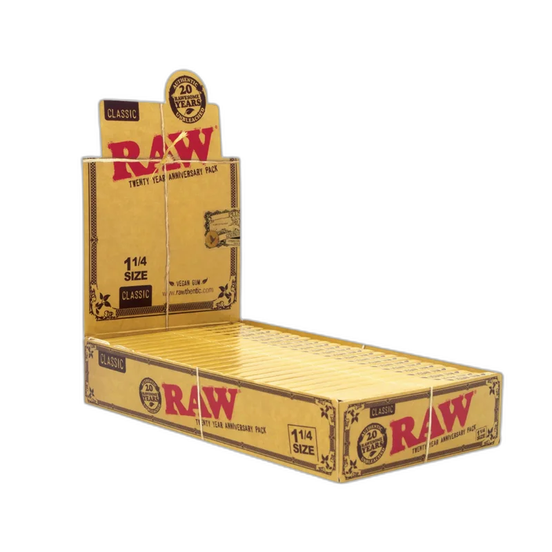 RAW CLASSIC ANIVERSARY 1 1/4 50CT ROLLING PAPERS DISPLAY OF 24 (RAW-194) The RAW Classic Anniversary 1¼ Rolling Papers celebrate RAW’s legacy of purity, craftsmanship, and unrefined quality. Specially released to honor the brand’s long-standing commitment to natural rolling products, this limited-edition anniversary pack features 50 unbleached, additive-free rolling papers made from RAW’s iconic natural fibers. Each sheet is crafted using RAW’s signature crisscross watermark , designed to preven