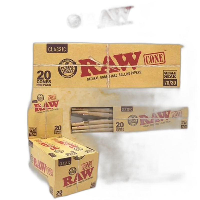 RAW CLASSIC SINGLE SIZE 70/30 CONES DISPLAY OF 12 (RAW-120) 20 CONES PER PACK 12 PACKS PER DISPLAY RAW Single Size Cones – each cone comes with a filling funnel and is a little smaller than 1¼.