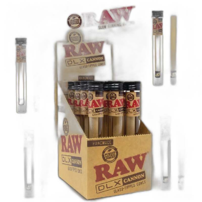 RAW GLASS TIPPED DLX CANNON CONES DISPLAY OF 12 (RAW-151) — RAW's premium cone designed for the discerning smoker. Made with glass for a clean taste and consistent burn rate. This product offers great value for stocking retail shelves or personal use. Available at wholesale from Port City Wholesale.