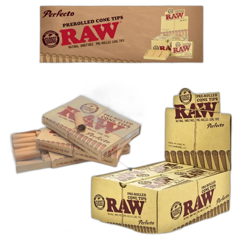 RAW PERFECTO PRE-ROLLED CONE TIPS - 20CT Makes Rolling Cones Easy; Boxes of Raw Pre Rolled Cone Tips; Natural and Unrefined “Perfecto” Cones are the best purchase for your storefront. Natural Unrefined Pre-Rolled Cone Tips Chemical and Chlorine Free 20 packs per box 21 tips per pack
