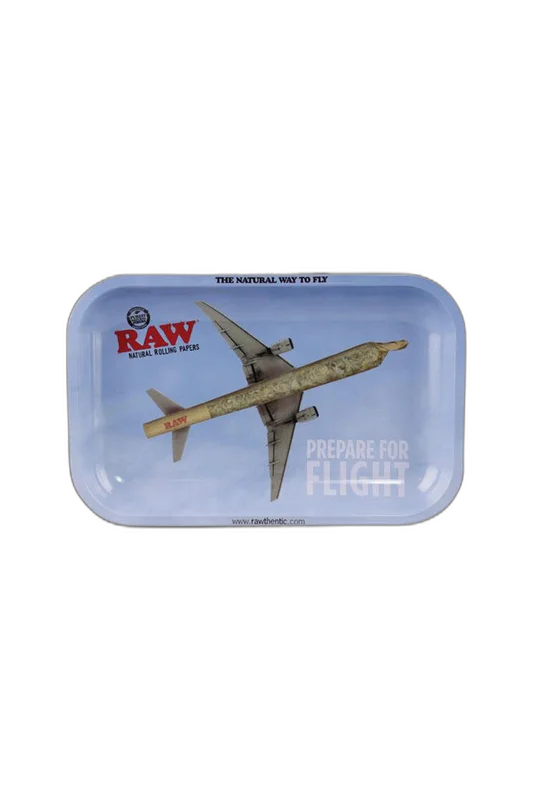 Get inspired for your next rolled mouthpiece with the RAW Prepare For Flight tray. This rolling tray features a playful cone airplane design that is bound to make your rolling more adventurous. It's made with durable and lightweight metal and has high sides to contain the material. This fun rolling tray comes in a size small, measuring 11 by 7 inches.