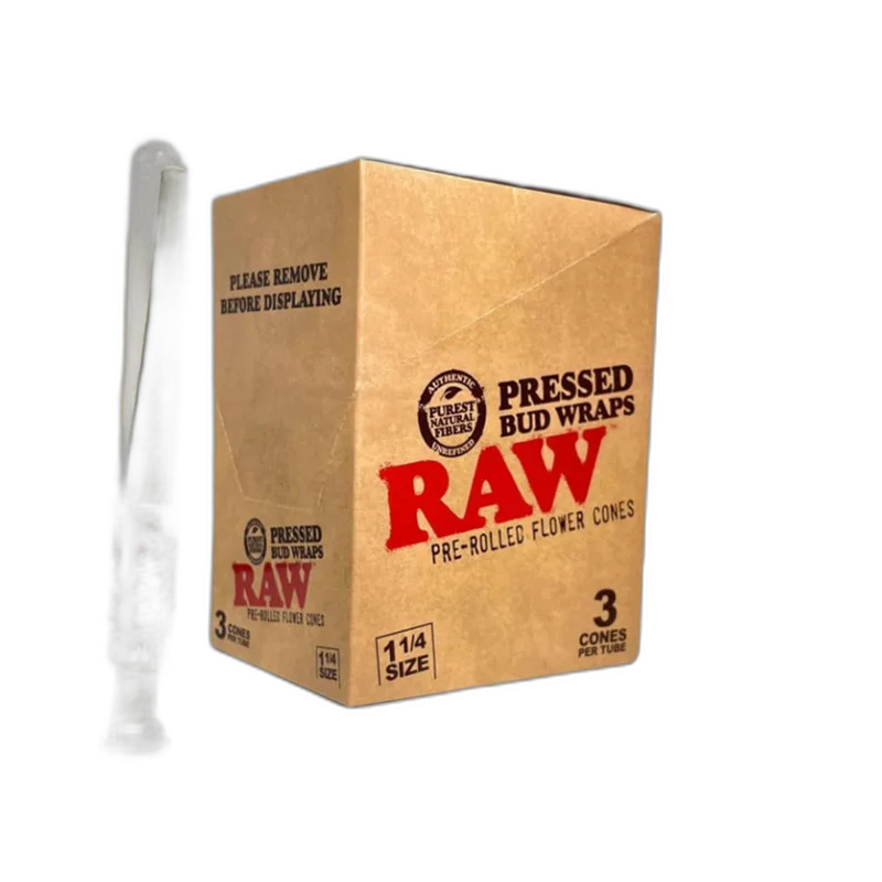 RAW PRESSED BUD WRAP 1-1/4 CONES DISPLAY OF 12 (RAW-146) RAW Pressed Bud Wraps are pre-rolled cones made from post-extraction cannabis material! These cones are made of the same type of natural material that will eventually be packed inside, creating a seamless, flavorful experience. They are free of THC so they can be sold in any shop. These are the 1 ¼ size cones that come with 3 pre-rolls packed in a classy glass tube with a packing stick. Displays hold 12 tubes. 12 TUBES PER DIS