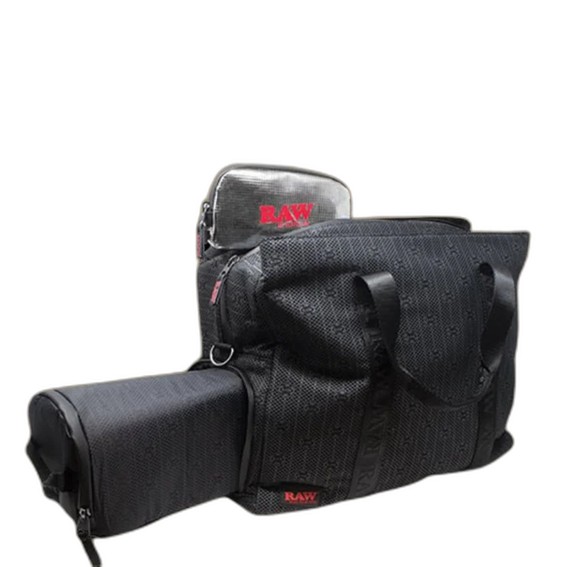 RAW RAWK & ROLL ALL NIGHT BAG (RAW-114) This badass bag has the RAW watermark faded over smoky black and a contrasting RAW RED interior. The center pouch has a triple bag-within-a-bag configuration featuring an internal, smell-proof, activated carbo, 5-layer pouch PLUS a foil smell locking bag. The lower section has discreet padded pull-out tube storage with a siliconized zipper! There’s an easy-access. outer deep pocket, 5 non-slip grip pads on the bottom of the bag and so much more!!