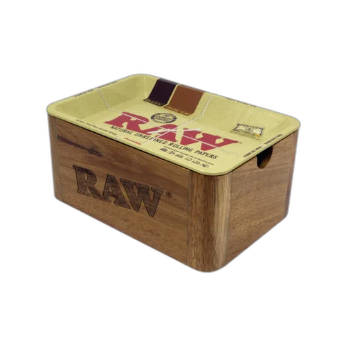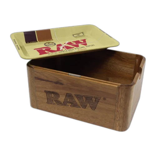 Wooden Cache Box With Metal Rolling Tray Lid - Mini by RAW. Well-made, functional, and priced to move. A solid addition to any smoke shop's product lineup. Suggested retail: $50.00.