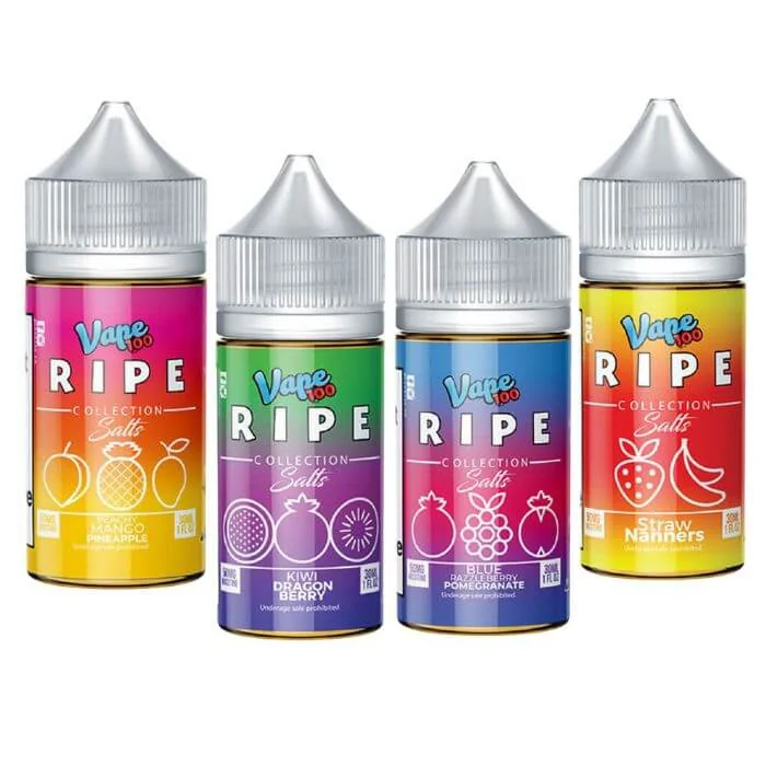 MOQ (Minimum Purchase Quantity): 12 Bottles ($75) Introducing the new Ripe Nicotine Salts in 30ml bottles, available in 35mg and 50mg nicotine strengths. Perfectly crafted for vape enthusiasts, these nicotine salts deliver smooth, satisfying hits with vibrant flavors. Explore the range of fruity blends, with and without icy finishes, to find your favorite. Flavor Descriptions: Blue Razzleberry Pomegranate: A bold blend of blue raspberry and tangy pomegranate. Blue Razzleberry Pomegranate On Ice: The same blue raspberry and pomegranate mix, enhanced with a cool menthol finish. Fiji Melons: A tropical trio of juicy watermelon, crisp apple, and sweet guava. Fiji Melons On Ice: Fiji Melons with a refreshing icy twist. Kiwi Dragon Berry: A fusion of ripe kiwi, dragon fruit, and mixed berries. Kiwi Dragon Berry On Ice: Enjoy the exotic kiwi, dragon fruit, and berry blend with a chilling menthol touch. Peachy Mango Pineapple: A succulent mix of peaches, mangoes, and pineapple. Peachy Mango Pineapple On Ice: The tropical blend of peaches, mangoes, and pineapple with an icy cool finish. Straw Nanners: A classic combination of ripe strawberries and sweet bananas. Straw Nanners On Ice: The beloved strawberry and banana duo with a menthol kick. Elevate your vaping experience with these meticulously crafted flavors from Ripe Nicotine Salts.