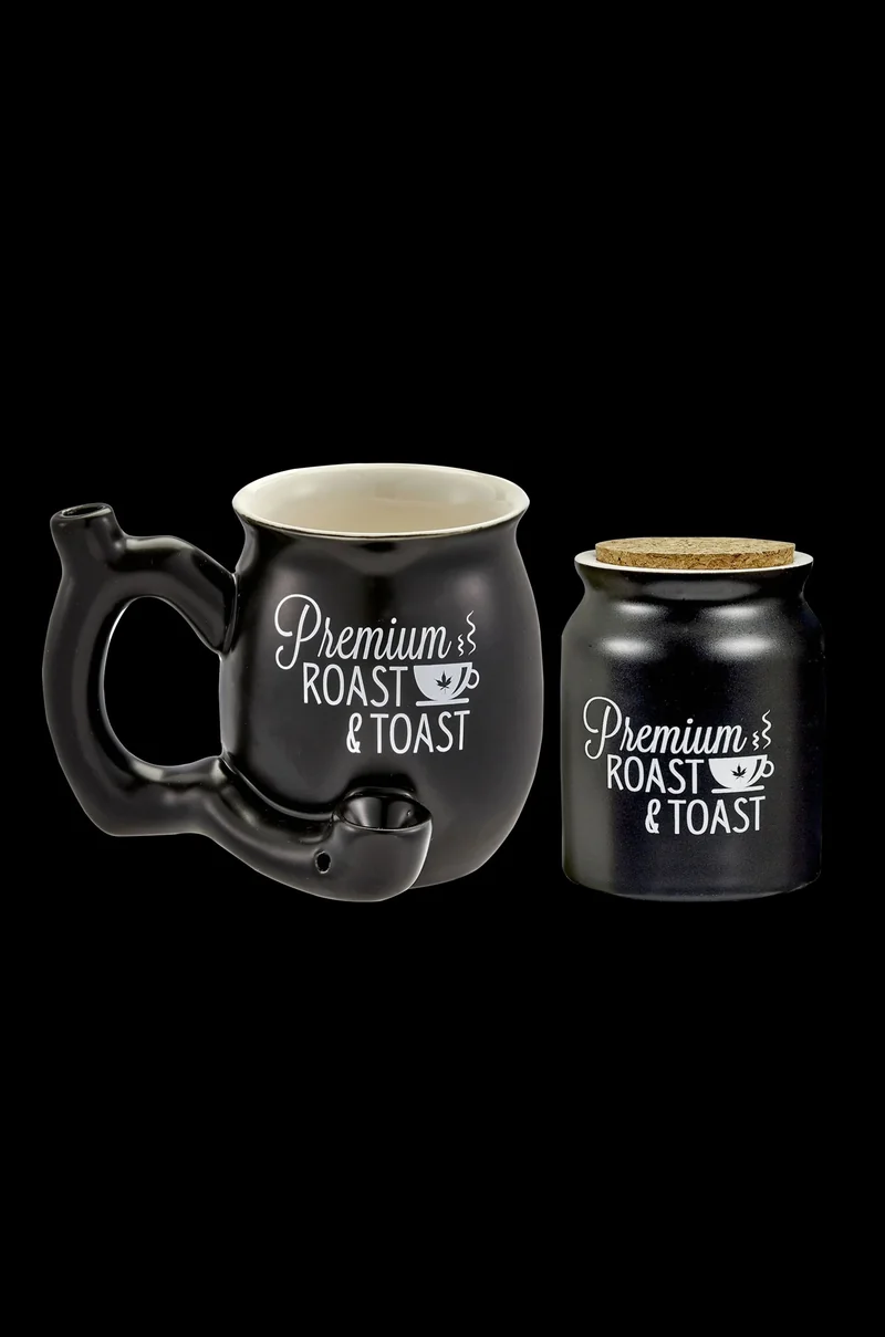 The Matte Black Bundle by Roast & Toast has everything you need to store your herbs and enjoy them in first-class style! This 2-piece set includes a Premium Roast & Toast Stash Jar made of ceramic material that is 4”H x 3”W in size. It comes with a tight-fitting cork lid to keep air and light outside so your herbs stay fresh. You also get a ceramic Premium Roast & Toast Mug Pipe for enjoying a hot cup of coffee and a smoke. The mug portion holds about 11 ounces of your favorite brew. There’s a dry pipe built into the mug with a herb bowl, carb hole for airflow control, and a mouthpiece for taking your hits that sits atop the hollow handle. The mug pipe is 4”H x 5.25”W in size. The stash jar comes packaged in an acetate bag and the mug pipe comes in a color box.