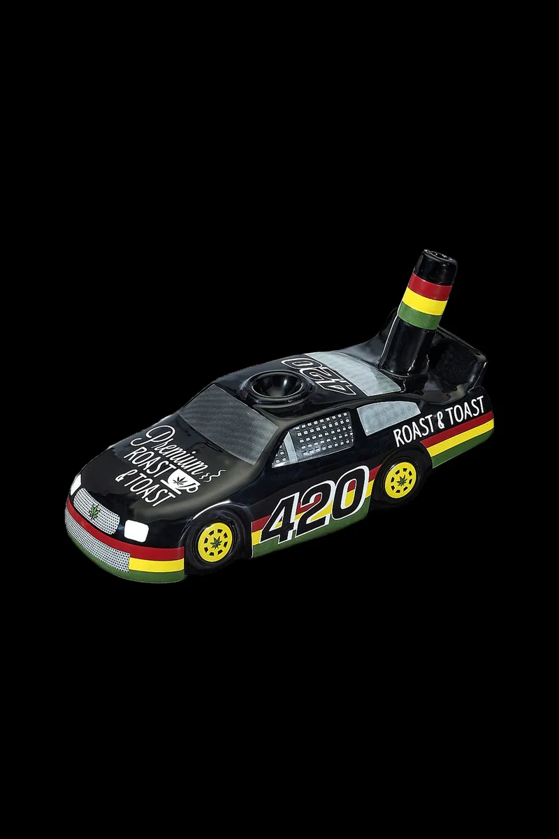 Rev your engine and get ready to enjoy an amazing smoking experience with the super slick Race Car Pipe by Roast & Toast . This colorful pipe designed like a race car measures 7”L x 3”W x 4”H in size. It’s made of a ceramic material and features rasta colors on the car and pipe and a cannabis leaf design on the wheels. When you light the bowl on the top of the car and take your draw, the smoke will travel through the hollow airway inside the racecar to the bent mouthpiece on the back. It’s a fun pipe to use and one your friends will surely want to try so be ready to share! The Race Car Pipe makes the perfect gift for any car buff you know who also likes to smoke herb. The pipe comes packaged in a color box, making it gift-giving ready.