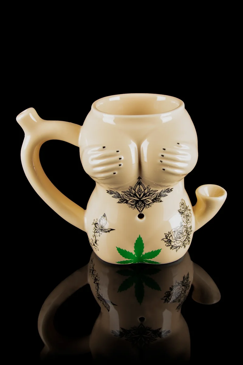 Perfect for any tattoo lover who enjoys a nice smoke, the Tattoo Girl Mug Pipe by Roast & Toast is a truly unique piece! This mug pipe measures 6¾”H x 4”W x 5”D in size and is made from a ceramic material. It features a tattooed female body design with hands covering the breasts. There’s a green cannabis leaf on the front for a nice touch of class! The mug portion of this mug pipe holds 10 ounces of your favorite brew. There’s a dry herb bowl attached to the side and a mouthpiece on top of the hollow handle. When you’re ready to enjoy a smoke, pack the bowl with your ground herbs, light up, and enjoy your puffs! This mug pipe makes a wonderful gift idea for any smoker in your life!