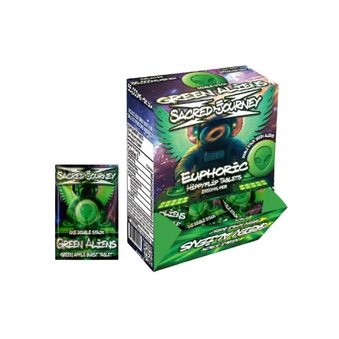 Power your momentum with Sacred Journey x Hippy Flips Tablets, crafted for fast-acting energy, mental clarity, and creative drive. Designed for high-performance moments, these tablets help support focus, motivation, and an elevated mindset—perfect for busy days, social events, workouts, or creative sessions. Each tablet delivers a bold flavor experience along with a convenient, on-the-go format for quick and easy use whenever you need a powerful mental lift. Product Highlights Fast-acting energy and focus support Promotes creativity, clarity, and motivation Convenient tablet format for on-the-go use Flavor-packed, easy to enjoy Flavors: Blue Dolphin: Electric blue raspberry with a bold, tangy kick. Green Aliens: Crisp green apple with a sweet-tart burst. Orange Buddahs: Bright citrus blend with refreshing zest. Pink Hearts: Sweet cotton candy flavor with a smooth finish. Purple Pandas: Rich grape taste packed with bold sweetness. Red Hulks: Tropical fruit fusion with an intense flavor punch. White Diamond: Creamy pina colada with coconut and pineapple. Yellow Butterflies: Juicy mango and pineapple tropical wave.