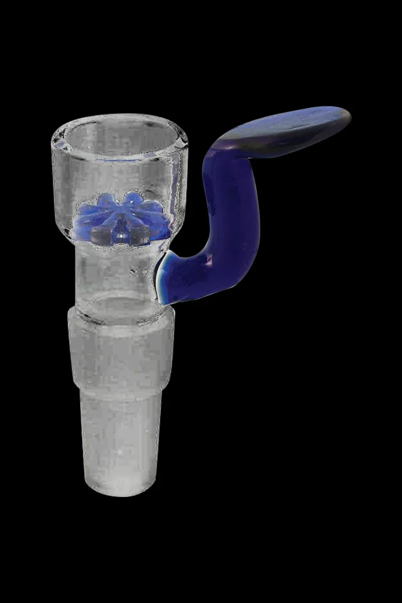 This stylish male herb slide fits both 14.5mm and 18.8mm female joints. It features a cool & curvy blue pull stem for easy handling. This nice looking slide is made of thick and sturdy borosilicate glass that can stand up to high temps. If you've got a bong with a 14.5mm or 18.8mm female joint that could use a touch of style and color, this awesome slide will get the job done. This slide would also make a great addition to a growing glass collection or the perfect gift for any bong owner. Because each slide is made individually, the one you get may vary somewhat in color.