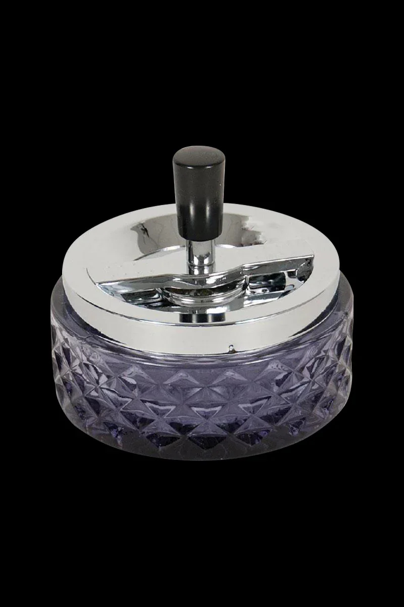 The Glass Spinning Ashtray is a classy and convenient pick for every smoker. The ashtray is made of glass in a Clear or Smoke color option. Designed for cigars, pipes, and cigarettes, it has a metal lid with a traditional spinning system. Unlike standard ashtrays, this spinning design removes your cigarettes in the bottom jar, to conceal ash and odors. Once it's filled, just remove the metal lid and dispose of the ash. Constructed with eye-catching textured glass, the Glass Spinning Ashtray a trendy and useful gift idea for a housewarming party or birthday. The ashtray measures 4.75 inches in diameter.