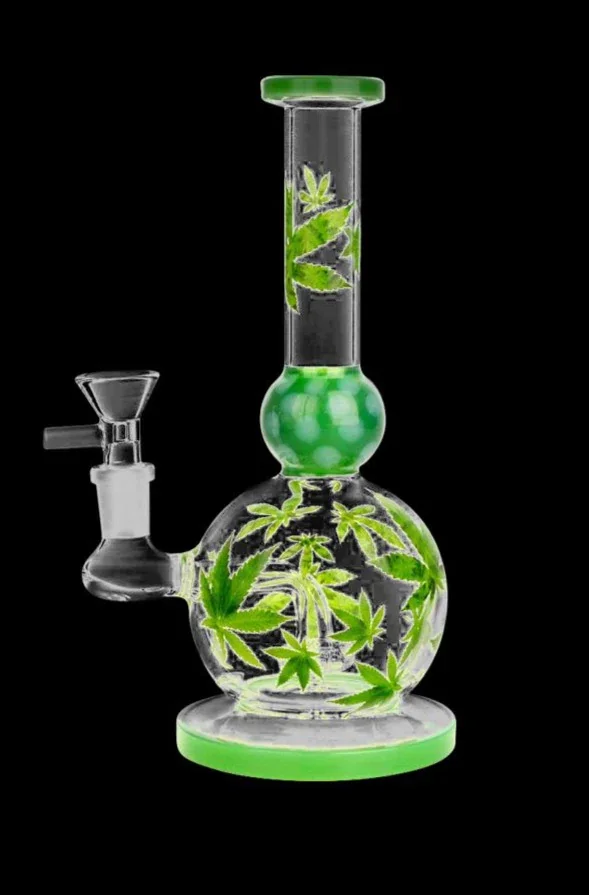 Celebrate your favorite plant with the Hemp Leaf Ball Water Pipe. This piece has a sphere-shaped main chamber that's decorated with bright green hemp leaves. The design extends to the neck and ends at the ergonomic mouthpiece on top. The base of the piece is thick and round, keeping it stable when out of use. This cool 420 piece stands 8.5 inches tall. It's outfitted with a 14.5mm female joint and comes with a handled 14.5mm male funnel-style bowl.