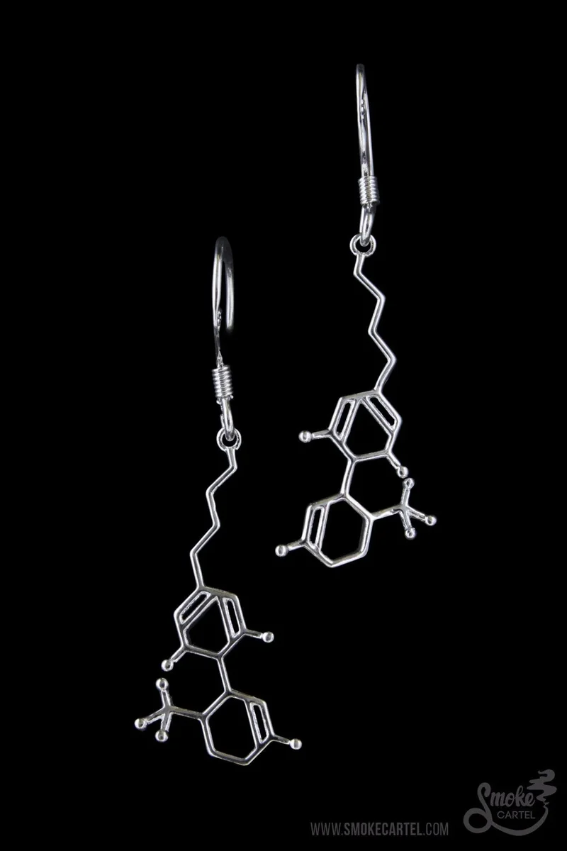 Do you hear what I hear? THC: can't live with it, can't live without it. Make your ears ring with these THC molecule earrings-- a charming and subtle way of showing love for your favorite chemical bond. Each piece of jewelry is made with fish hook style back. The molecule pendant measures at 1". Available in the two luminous finishes of Silver and Rose Gold. 1.5" Overall Size Comfortable to Wear 925 Sterling Silver Plated Brass Rose Gold Plated Sterling Silver