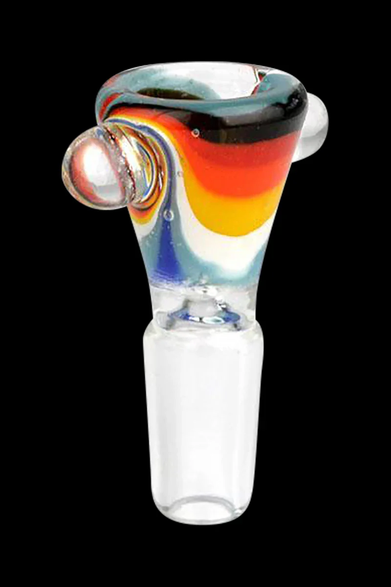 In the market for a new glass slide for your water pipe or bong? The Worked Swirl Herb Slide is one nice looking piece that will add a splash of color to whatever piece you attach it to. This herb slide features a male groundless joint that's available in 14.5 mm or 18.8 mm joint sizes. The slide has raised glass marbles attached to the sides for easy handling of the bowl. With its colorful worked swirl design, this herb slide is a beautiful piece you'll be proud to own. Because each slide is individually made from thick & durable boro glass, the colors of the worked glass bowl may vary from what's pictured. This beauty fits water pipes and bongs with 14.5 mm and 18.8 mm female joints . Pick the size you need and get one today!