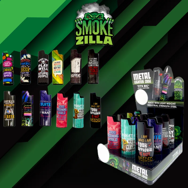 SMOKE ZILLA PRINTED LIGHTER CASE DISPLAY OF 12 (23785) — a well-crafted lighter designed for reliability and ease of use. Built to last through regular use. An excellent addition to any shop inventory or personal collection. Wholesale quantities available at Port City Wholesale.