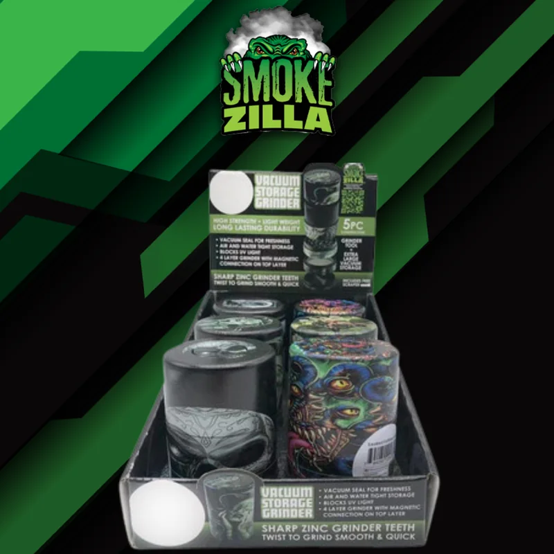 SMOKE ZILLA VACUUM STORAGE GRINDER DISPLAY OF 6 (22578 These Vacuum Containers are perfect for storing tobacco, money, medicine, and more. Vaccum containers are made with food grade plastic and are airtight and smell proof. Features a 5-piece construction and each display holds an assortment of designs.