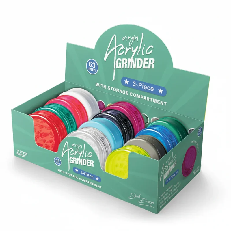 MSRP $2.99 63MM MSRP $6.99 90MM Durable 3-piece grinder made from high-quality virgin acrylic. Features sharp teeth for a smooth grind and a built-in storage compartment for added convenience. Finished with various designs and available in assorted mixed colors. Lightweight, portable, and ideal for everyday use. Features: 3-piece design with storage compartment Virgin acrylic construction 63mm diameter or 93mm diameter Sharp grinding teeth Magnetic closure Mixed colors (assorted) 12 Count Display