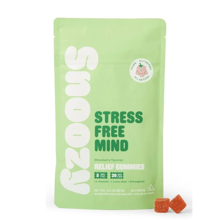 Whether you're dealing with the demands of work, family, or just the daily grind, Snoozy Relief Gummies offer a natural and effective way to manage stress and find inner peace. Our Delta 9 gummies are made with organic and all-natural ingredients and feature a blend of Delta 9 THC, CBD, L-theanine, lemon balm, and ashwagandha to help calm the mind and melt away worries. Active Ingredients (per gummy): Delta 9 THC: 5mg CBD: 20mg Ashwagandha: 50mg L-theanine: 50mg Lemon Balm: 50mg Additional Information: Federally compliant according to the 2018 Agricultural Improvement Act and legal in most states. Made from USA-grown hemp. Formulated with natural ingredients to help you find relief and calm. Flavored with organic extracts derived from strawberries