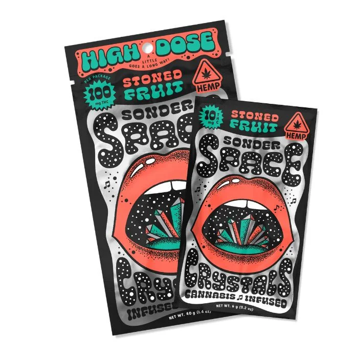 Sonder Space THC Crystals combine nostalgia and innovation in one fun, fast-acting treat. Infused with 10mg or 100mg THC per pouch, these sublingual popping candies use Sublingual Crystal Technology™ for rapid absorption and a flavorful, full-spectrum experience. Perfect for on-the-go enjoyment, Sonder Space Crystals are ideal for retail and wholesale customers seeking a discreet and tasty way to elevate. Flavors: Cheers Queers- Strawberry • Champagne: A comet of glitter, cosmic champagne, and strawberry love orbit you as you toast your chosen family with this juicy addition to our Sonder family. Peachy Passion - Passion Fruit • Peach: In a crystalline galaxy far, far away begins a love story of celestial peachy sweetness and a fruit with a passion for fashion. Gravity pulled these two lovers into a supernova of flavor and feels that tickle the tongue. Piña Colada Piñata - Pineapple • Coconut • Lime: A big bang of creamy coconut, lime and pineapple blankets your taste buds as your body and mind dance the space-time boogie! Pineapple Party - Pineapple • Strawberry: A tasty tango of strawberry space dust and pineapple starlight gets you feeling better than alright! Stoned Fruit - Apricot • Peach • Nectarine: Tune into this flavor transmission: apricot, peach and nectarine moon walk onto your tongue with this tasty trio of Stoned Fruits. Spooky Oooky - Spicy Cinnamon: Astrological ghost stories bring the Spooky Oooky to this spicy cinnamon explosion we found on the darker side of the moon. Wake N' Bacon - Maple Syrup • Vegan Bacon Pieces: An asteroid of chewy, salty, bacony goodness passes through a maple syrup galaxy in this curious culinary journey of the tongue. Watermelon Wizard - Watermelon • Citrus: Mouth-watering magic is afoot with this dynamic duo of juicy watermelon and meyer lemon stardust. Abracadabra, Sondernauts! Frosty the Stoned Man - Hot Chocolate & Marshmallow: Baby, it’s mayb