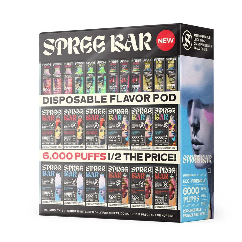 FLAVOR PODS ARE BACK with the SPREE BAR – a revolutionary disposable flavor pod system from the creators of Pachamama! Immerse yourself in an amazing vaping experience, merging award-winning flavors with cutting-edge technology. Preserve your reusable battery and replace the flavor pod, a sustainable choice for your wallet and the planet! Key Features: 6000 Puffs - No PMTA required. 9 Exciting Flavors - Truly unique design. Rechargeable and Reusable Battery. Disposable Flavor Pod at half the price! 5% Metatine. Bundle Includes: Acrylic Display. Tester Station. Each Bundle Contains: 6 Starter Kit 10 Packs MSRP $19.99 Blood Orange Peach. Blue Razz Ice. Creamy Melon. Strawberry Apple Melon. Strawberry Mango. Sweet Spearmint. 6 Flavor Pod 10 Packs MSRP - $11.99 Blood Orange Peach. Blue Razz Ice. Pineapple Coconut. Rainbow Fruit. Sweet Spearmint. Watermelon Grapefruit. 6 Replacement Battery 10 Packs MSRP $9.99 Elevate your vaping retail with the ultimate SPREE BAR bundle – where innovation meets affordability and sustainability!