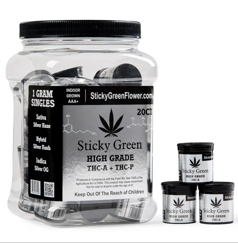 Sticky Green High Grade THC-A Flower showcases superior quality with potent THC-A content. Each 1g jar features carefully cultivated, sticky buds with exceptional genetics, delivering a robust cannabis experience. Meticulously sealed to maintain freshness, this flower is perfect for retailers looking to offer premium, high-grade cannabis with an elevated experience. Sticky Green High Grade THC-A Flower 1G Display Features: Superior Quality: Step into the realm of superior cannabis with carefully cultivated and handpicked High Grade THCA Flower. Exceptional Genetics: Each nugget showcases the finest genetics, cultivated to perfection for an exceptional terpene profile. Potent THCA Experience: Delivers a potent THCA experience, promising a robust and flavorful encounter with every inhalation. Sticky Texture: Meticulously grown flowers boast a sticky texture, indicative of rich resin content. High-Grade Infusion: Infused with high-grade THC-A and THC-P cannabinoids known for their potency and purity. Meticulously Crafted: Each jar contains 2.5 grams of premium flower, crafted for potency and purity. Sealed for Freshness: Meticulously sealed to preserve freshness and aroma, ensuring optimal quality during every session. Elevated Experience: Provides effects for an elevated cannabis experience. Sticky Green High Grade THCA Flavors/Strain: Silver Haze - Sativa: A potent and uplifting strain with energetic effects, known for its spicy, citrus flavors and earthy undertones. Silver Kush - Hybrid: A balanced hybrid offering a mix of relaxation and subtle euphoria, with hints of citrus and pine flavors. Silver OG - Indica: A calming indica with deep, earthy flavors and a smooth finish, perfect for relaxation and stress relief. Mixed: An exquisite fusion of 7g Sativa, 7g Indica, and 6g Hybrid strains, this premium blend delivers a harmonious experience from start to finish. Sticky Green High Grade THCA Wholesale: Sticky Green High Grade THCA is ideal for tho