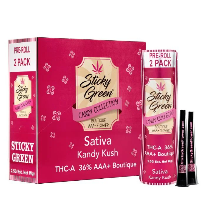Enjoy the sweet escape of Sticky Green’s Candy Collection Pre Rolls—crafted with premium THC-A flower for a flavorful and effective experience. Each pre-roll blends top-shelf strains for a candy-inspired smoke that caters to every mood. Flavors & Effects: Kandy Kane (Indica): Rich, soothing, and perfect for stress relief and deep relaxation. Kandy Kush (Sativa): Sweet citrus notes deliver uplifting, energizing effects—ideal for daytime focus. Kandy Runtz (Hybrid): Fruity, balanced, and euphoric—great for creative or social moments. Perfect for consumers and retailers looking for flavorful, ready-to-enjoy THC-A pre-rolls.
