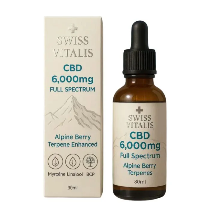 Swiss Vitalis CBD 6000mg is a high-strength full spectrum CBD oil enhanced with our proprietary Alpine Terpenes blend. Crafted in Switzerland, this formula is designed to support balance, relaxation, and overall wellness through the entourage effect. Key Benefits Ultra-Potent 6000mg Full Spectrum CBD – Delivers maximum cannabinoid synergy for body and mind. Alpine Terpenes Blend – Featuring Myrcene, Linalool, and β-Caryophyllene for enhanced effectiveness. Swiss Crafted – Inspired by Alpine purity, made with clean extraction and premium quality controls. Third-Party Tested – Verified transparency with full-panel lab results. Alpine Terpenes Flavor & Effect Profiles β-Caryophyllene – Peppery notes that support recovery and interact with CB2 receptors. Linalool – Floral, lavender-like taste known for calming and stress relief. Myrcene – Earthy, herbal aroma that promotes deep relaxation and comfort. Swiss Heritage – Pure by NatureRooted in Swiss craftsmanship, Swiss Vitalis CBD 6000mg is made with Alpine water sources, clean extraction, and rigorous testing. Each batch is consistent, potent, and compliant with THC regulations. Lab-Tested Purity You Can Trust Verified cannabinoid and terpene content Legal THC compliance (0.3% or less) Free from pesticides, heavy metals, and solvents Experience the unmatched strength of Swiss Vitalis CBD 6000mg, where full spectrum CBD meets Alpine purity.