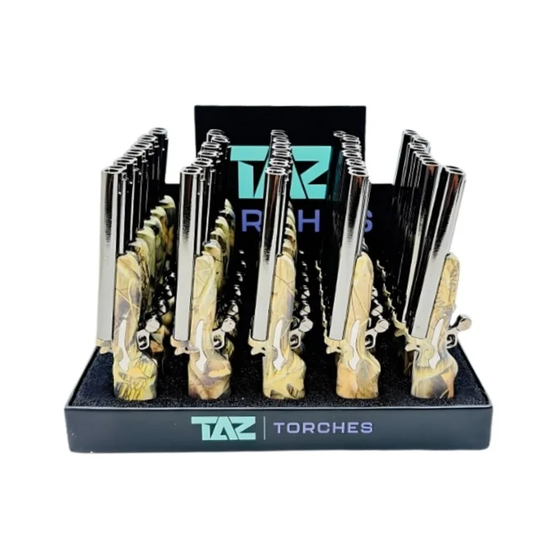 TAZ TORCHES CAMO GUN DESIGN TORCH DISPLAY OF 20 (TT-58-A) Stand out with the TAZ Torches Camo Gun Design Torch – Display of 20 (TT-58-A) . Featuring a bold gun-shaped design with camouflage detailing , these novelty torches combine unique style with powerful torch performance , making them a strong addition to any retail lineup. Each lighter produces a powerful, wind-resistant flame that’s perfect for cigars, bowls, and concentrates. The camo gun design adds eye-catching appeal, ensuring these t