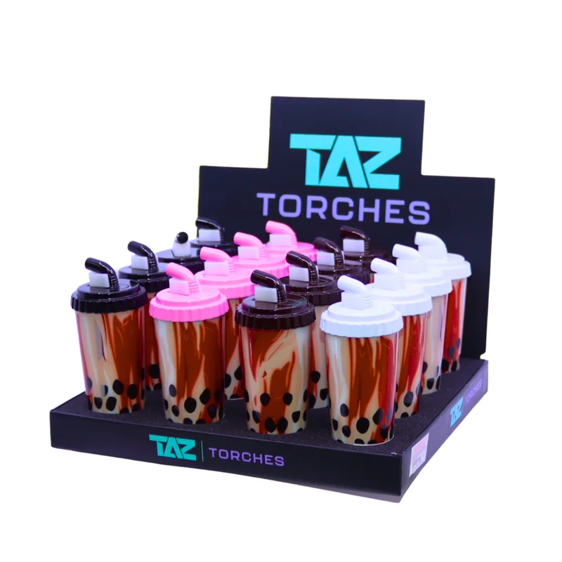 TAZ TORCH WINDPROOF LIGHTER CUP WITH STRAW DESIGN DISPLAY OF 16 Serve up flames in style with the TAZ Torch Windproof Lighter Cup with Straw Design – Display of 16 . Built to look like a fun drink cup with a straw , this novelty lighter blends playful design with powerful torch performance , making it both a conversation starter and a practical tool. Each lighter produces a strong, windproof flame that’s perfect for cigars, bowls, bangers, and outdoor use. The cup-and-straw design makes it a sta