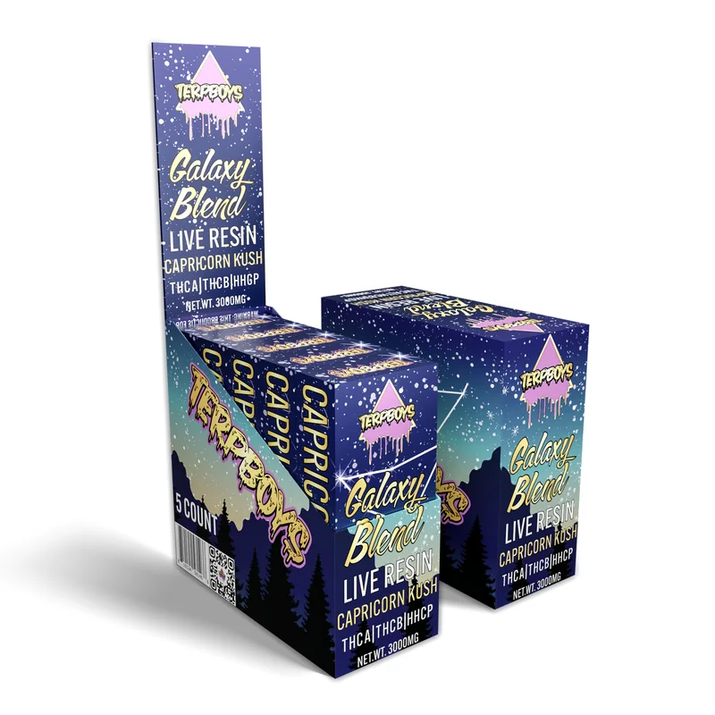 Introducing Terpboys Galaxy Blend Disposable Vape 3G, a phenomenal fusion of THCA, THCB, and HHCP in six delightful flavors. Crafted with precision and featuring Live Resin, Live Diamonds, and Live Rosin, our rechargeable 3g disposables ensure a seamless, enduring vaping experience with a built-in preheat function. Key Features: THCA/THCB/HHCP Blend. 3g Disposables. Rechargeable. Preheat Function. Live Resin, Live Diamonds, Live Rosin. Embark on a cosmic journey with our captivating flavor selection: Capricorn Kush (Live Resin). Taurus Blood (Live Rosin). Leo Lemon (Live Diamonds). Saturn's Rings (Live Resin). Cosmic Melon (Live Rosin). Pisces Peach (Live Diamonds). Experience the pinnacle of vaping pleasure with Terpboys Galaxy Blend 3G, where premium blends and innovative design converge for an unparalleled, enduring vaping experience.