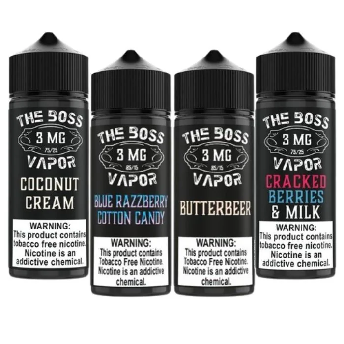 The Boss Vapor E Liquid is crafted for a premium vaping experience, offering a variety of unique flavors in 120ML and 60ML bottles. Available in nicotine strengths from 0mg to 12mg, it caters to a wide range of customer preferences. Whether customers are looking for a light, refreshing vape or a stronger hit, The Boss Vapor E Liquid delivers a satisfying experience with every puff. Ideal for vape shops wanting to offer a high-quality, enjoyable vaping experience. The Boss Vapor E Liquid Features: Bottle Sizes: Available in 120ML and 60ML Nicotine Strengths: Choose from 0MG, 3MG, 6MG, and 12MG Flavor Profile: A variety of unique and satisfying flavors Crafted For: A premium, enjoyable vaping experience The Boss Vapor E Liquid Flavors: Blue Razzberry Cotton Candy: Dive into the sweet and tangy fusion of blue raspberry and fluffy cotton candy, delivering a nostalgic carnival treat. Butterbeer: Indulge in the rich, creamy flavor of butterbeer, combining butterscotch and caramel for a magical vaping experience. Coconut Cream: Enjoy the tropical taste of smooth coconut cream, perfect for a refreshing and exotic escape. Cracked Berries And Milk: Savor the delightful blend of ripe berries and creamy milk, reminiscent of a classic breakfast favorite. Orange Dream: Relish in the zesty and creamy combination of sweet oranges and smooth vanilla ice cream. Sledge Hammered: Feel the powerful punch of mixed fruits with a menthol kick, providing an invigorating and refreshing vape. Strawberry Cheesecrack: Delight in the rich taste of strawberry cheesecake with a graham cracker crust, delivering a dessert-like vaping experience. Strawberry Milkshake: Sip on the classic taste of a creamy strawberry milkshake, blending ripe strawberries and smooth vanilla ice cream. Sweet Rainbow: Taste the rainbow with this vibrant mix of fruity flavors, offering a sweet and colorful vaping journey. Sweet Strawberry: Enjoy the pure, sweet flavor of ripe strawberries, providing a simple yet