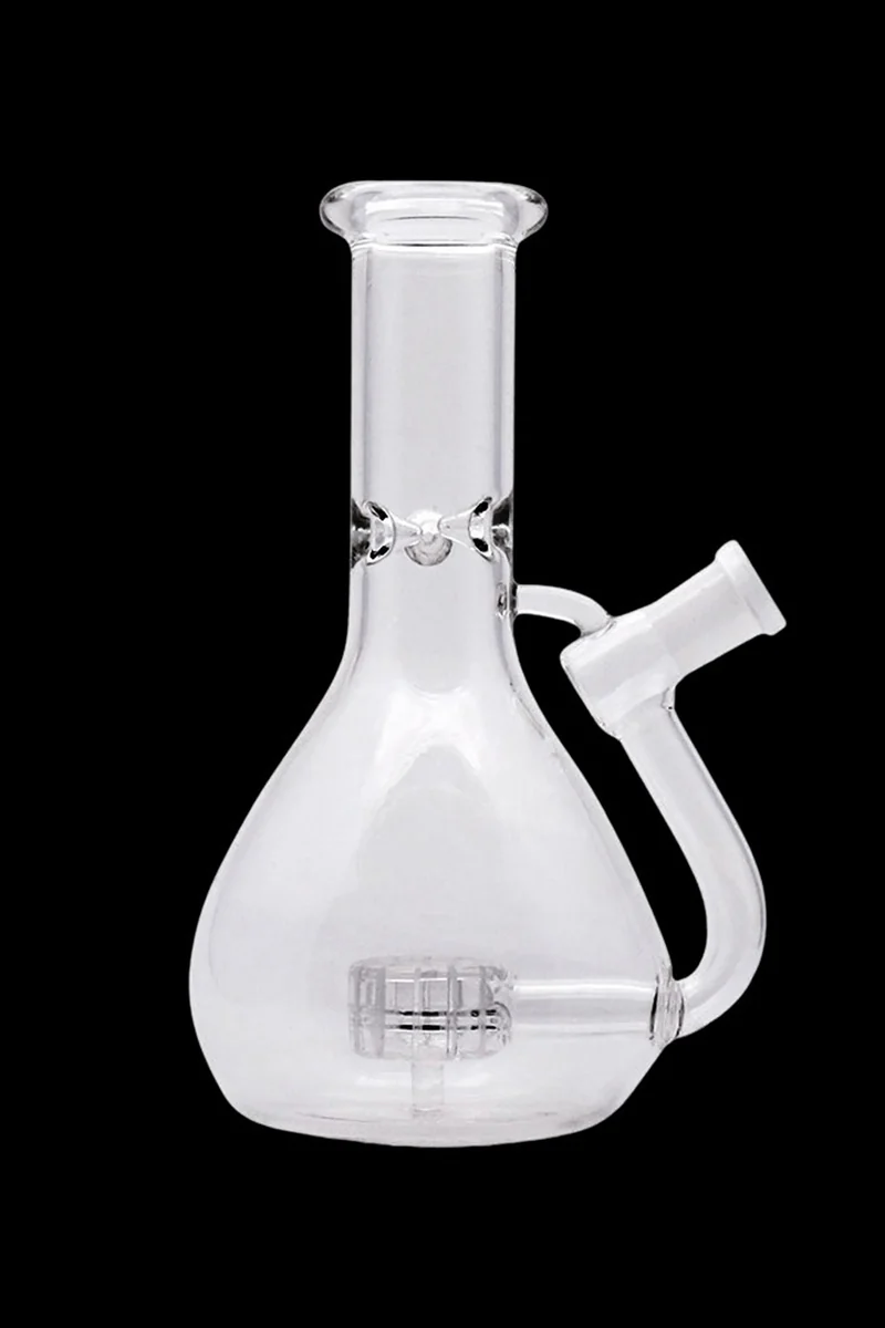 The Exo Stem Beaker features a unique design. A traditional beaker in every way but with one peculiar difference, the downstem runs through the outside of the piece and enters through the base to connect to a showerhead percolator. 7in tall Unique external downstem 14.5mm Female connection 45 degree joint Showerhead percolator