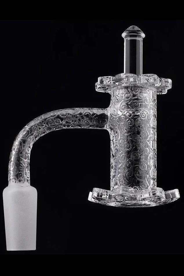 The unique and efficient Lotus Etched Quartz Blender Banger Set with Quartz Carb Cap & Terp Pearls features a beautiful and organic pattern etched into the glass. The set features a lotus flower shaped dish and carb cap giving this blender a very special look. The set also includes a pair of terp pearls to efficiently move your concentrates around the bucket. The dish will guide your concentrates to the sweet spot making it super efficient as none of your precious concentrates are wasted. Anything that is not vaporized will drip back into the dish to be vaporized again. Just heat the dish and stem. Place your concentrates on the dish or the base of stem and the slits in the bottom will pull the concentrates up the stem and bucket for dense flavorful clouds. To clean, simply use a cotton swab while the banger is still hot. Do not use any cleaning solution while the banger is still hot. Etched pattern Lotus shaped dish & cap x2 Terp Pearls Beveled edge top Real quartz Incredible heat retention Enhances flavor