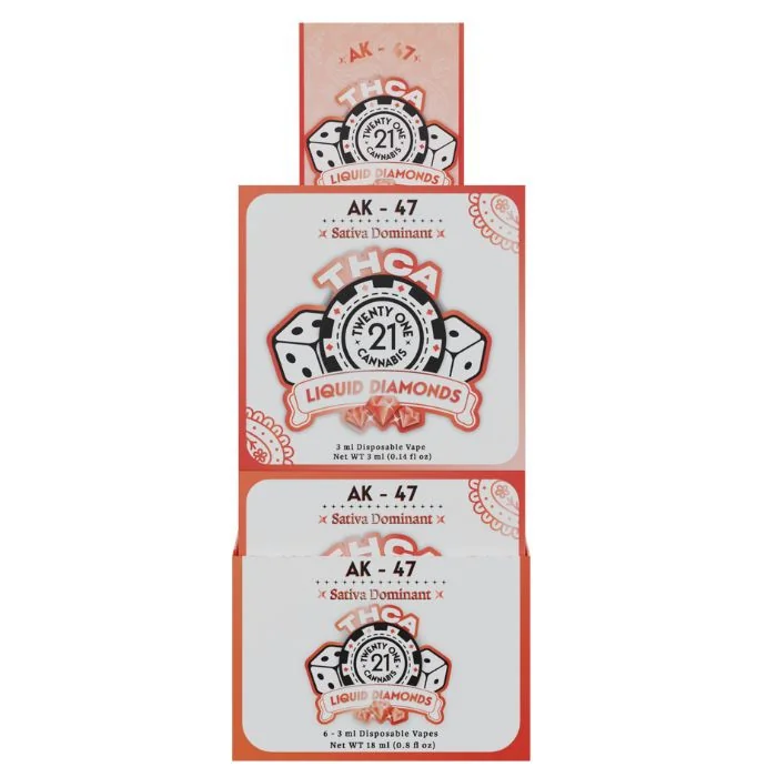 The Twenty One Cannabis Liquid Diamonds THCA Disposable 3G is designed for smooth, flavorful vaping with 2,257mg of Delta-8, 203mg of THCA Liquid Diamonds, and 138mg of HHC. Rechargeable with a USB-C port, it features a 0.8Ω ceramic coil and a sleek ergonomic design, perfect for a premium vaping experience. Twenty One Cannabis Liquid Diamonds THCA Disposable 3G Features: Potent Blend: Combines 2,257mg Delta-8, 203mg THCA Liquid Diamonds, and 138mg HHC for powerful effects. THCA Benefits: Supports sleep, appetite, and mood enhancement with a relaxing, heady high. Premium Design: Sleek, ergonomic 3g disposable with an oil-viewing window. Efficient Heating: 25W device with a 0.8Ω ceramic coil and pre-heat button for smooth vaping. Rechargeable: USB-C port (cable not included) for convenient recharging. Farm Bill Compliant: Contains < 0.3% Delta-9 THC. User-Friendly: Pre-filled, pre-charged, and available in juicy flavors and strains. Twenty One Cannabis Liquid Diamonds Flavors: Nicknamed “One Hit Wonder”, AK-47 is known for being so potent that one hit will have less experienced smokers wondering what day it is. As long as you know what you’re getting into, this strain will leave you feeling relaxed and at ease. Earthy with hints of pine, this THCa liquid diamonds disposable vape is also balanced with sweet, floral notes. Although potent, its effects are mellow and relaxing. The hints of lighter citrus tones further add to the calming effects. You’ll find that AK-47 offers the perfect cerebral buzz for any creative or social endeavors. Breathe in serenity with the OG Kush THCa liquid diamonds disposable vape. The inhale reveals subtle notes of lemon-pine and wood, for an aroma that’s as timeless as it is inviting. With its soothing blend of earthy and herbal notes, the OG Kush strain envelops your senses in a comforting embrace. An indica-dominant strain, OG Kush is known to melt away stress and tension, lea