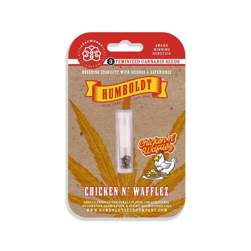 Disclaimer: These statements have not been evaluated by the U.S. Food and Drug Administration. This product is sold as collectible botanical specimens only and is not intended for human or animal consumption. You must be 21 years or older to purchase. By ordering, you certify that you are legally permitted to purchase and possess marijuana seeds in your jurisdiction. Marijuana seed legality varies—verify and comply with all applicable federal, state, and local laws before ordering. It is your responsibility to ensure you may lawfully import, possess, or germinate these seeds. Safety Notice: Store seeds in a cool, dry place away from direct sunlight and out of reach of minors and pets. Do not ingest or smoke seeds. Wear gloves and wash hands after handling seeds to avoid skin irritation or accidental ingestion. Keep seeds in their original packaging until ready for lawful planting. Buyer’s Responsibility: By completing your purchase, you agree to hold Port City Wholesale harmless from any legal consequences arising from unauthorized importation, possession, or cultivation of marijuana seeds. All of our premium seeds are grown in California and are perfect for a range of growers, whether it be beginners looking to learn the craft or experts wanting to add a quality, hassle-free plant to their lineup. Our seeds, in their present state, contain less than 0.3% THC, classifying them as legal hemp seeds under the 2018 farm bill. Humboldt Chicken N Wafflez Cannabis Seeds 3 Seeds Per Pack - (1 Count) Chicken n ’ Wafflez , it’s what’s for breakfast, dinner and you won’t be skipping lunch. Guaranteed to be one of our all-time greatest creations, this strain is gourmet without the pretentiousness, potent without the anxiousness and inspiring without incapacitating. The fusion of buttery maple syrup terpenes poured over golden waffles followed by our secret blend of herbs and spices makes this admittedly unlikely fla...