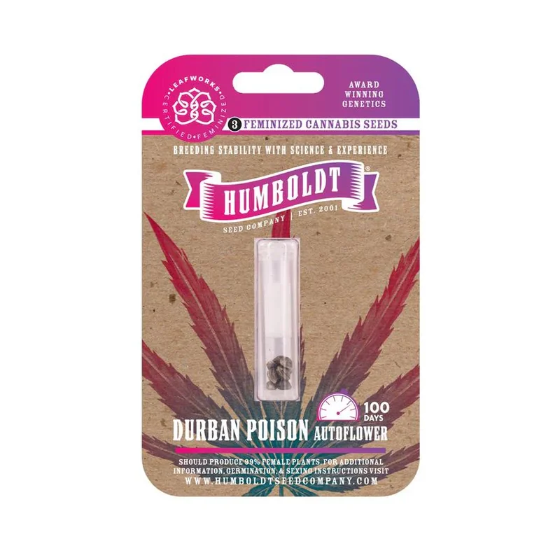 Disclaimer: These statements have not been evaluated by the U.S. Food and Drug Administration. This product is sold as collectible botanical specimens only and is not intended for human or animal consumption. You must be 21 years or older to purchase. By ordering, you certify that you are legally permitted to purchase and possess marijuana seeds in your jurisdiction. Marijuana seed legality varies—verify and comply with all applicable federal, state, and local laws before ordering. It is your responsibility to ensure you may lawfully import, possess, or germinate these seeds. Safety Notice: Store seeds in a cool, dry place away from direct sunlight and out of reach of minors and pets. Do not ingest or smoke seeds. Wear gloves and wash hands after handling seeds to avoid skin irritation or accidental ingestion. Keep seeds in their original packaging until ready for lawful planting. Buyer’s Responsibility: By completing your purchase, you agree to hold Port City Wholesale harmless from any legal consequences arising from unauthorized importation, possession, or cultivation of marijuana seeds. All of our premium seeds are grown in California and are perfect for a range of growers, whether it be beginners looking to learn the craft or experts wanting to add a quality, hassle-free plant to their lineup. Our seeds, in their present state, contain less than 0.3% THC, classifying them as legal hemp seeds under the 2018 farm bill. Humboldt Durban Poison AutoFlower Cannabis Seeds - 3 Seeds Per Pack - (1 Count) Durban Poison made waves in Humboldt back in the late nineties and a select few legacy cultivators made a point of preserving clones even though the longer flowering time made it less desirable for commercial production. In 2021 we were gifted the original Durban cut and we set out to stabilize it as an autoflower seed line, a process that takes several years and at least four generations of sifting through ...