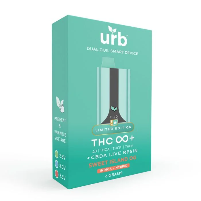 Experience the pinnacle of cannabis indulgence with the limited edition Urb Infinity Blend Disposable. Expertly crafted for connoisseurs, this exclusive THC Infinity+ blend features a potent mix of D8, CBDA Live Resin, THCA, THCP, and THCH, delivering unmatched satisfaction. Available for a limited time only. Flavors available: Cupcake Kush: A sweet and creamy blend with vanilla cupcake notes, complemented by subtle herbal undertones for a decadent vaping experience. Goji Gelato: A luscious fusion of tangy goji berries and creamy gelato, offering a smooth and fruity vape with a touch of richness. Lemonade Kush: A refreshing citrus blend of zesty lemonade and earthy kush, balancing tartness with a hint of herbal complexity. Mango Kush: A tropical treat featuring ripe mangoes paired with a touch of kush, creating a juicy and exotic vape with a mellow finish. Orangeade: A vibrant combination of sweet orange and zesty lemonade, delivering a citrusy burst of flavor with a refreshing twist. Sweet Island OG: A tropical escape with a blend of ripe fruits and a hint of earthy OG, offering a smooth and sweet vaping experience reminiscent of an island getaway.