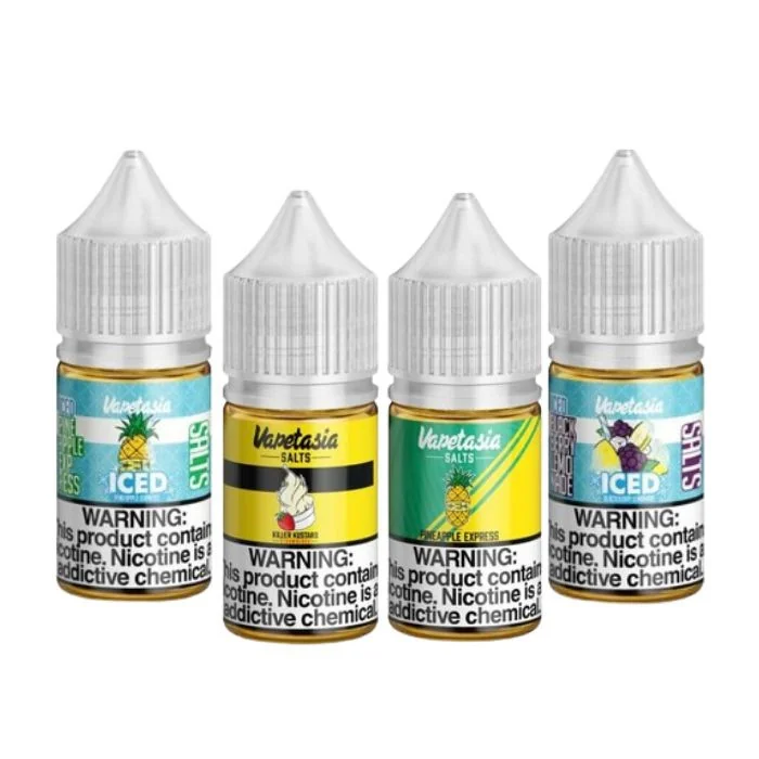 Vapetasia Nicotine Salts are crafted for vapers who appreciate bold, complex flavor profiles in a compact format. Each 30ml bottle delivers smooth and satisfying throat hits with strengths available in 24mg and 48mg. Known for their signature blends, Vapetasia Nicotine Salts Flavors span fruity, creamy, and icy options that cater to different preferences. Designed for pod systems, these salts provide a consistent and enjoyable vaping experience that keeps customers coming back. With their premium quality and flavor diversity, Vapetasia Nicotine Salts remain a top choice among vape enthusiasts seeking dependable performance. Vapetasia Nicotine Salts Features: 30ml bottle size Nicotine strengths: 24MG & 48MG Bold, flavorful blends Fruity, creamy & icy options Smooth & satisfying throat hits Crafted for vape enthusiasts Vapetasia Nicotine Salts Flavors: Blackberry Lemonade – A sweet and tart mix of juicy blackberries and tangy lemonade. Blue Razz Killer Fruits – A vibrant blue raspberry flavor that bursts with fruity sweetness. Blueberry Killer Kustard – Creamy custard with a rich blueberry twist. Grape Killer Fruits – Bold grape flavor with a smooth finish. Iced Blackberry Lemonade – A cool, refreshing version of the blackberry lemonade blend. Iced Blue Razz Killer Fruits – Blue raspberry enhanced with a crisp menthol finish. Iced Grape Killer Fruits – A chilly spin on sweet grape. Iced Milk of The Poppy – Strawberry and dragon fruit blend, topped with ice. Iced Pango Killer Fruits – Tropical mango and pineapple, served cold. Iced Pineapple Express – Chilled pineapple and tropical notes. Iced Rain Bops – A frozen burst of sweet fruity candy. Iced Straw Guaw Killer Fruits – Icy strawberry and guava fusion. Iced Trapple Killer Fruits – Crisp apples with an invigorating menthol breeze. Iced White Gummy – A cool and chewy white gummy flavor. Killer Kustard &ndash