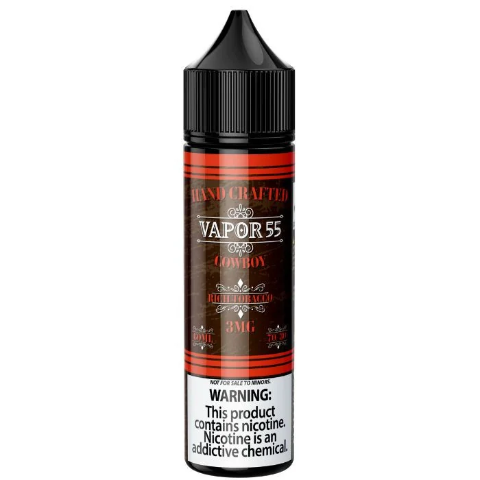 Discover the Cowboy E-Liquid by Vapor 55 Tobacco. This versatile vaping device is built to handle everything from casual sessions to extended use. Compact, powerful, and easy to maintain — it is a smart addition to any vape inventory. Wholesale orders available at Port City Wholesale.