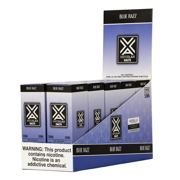 NICOTINE SALTS | PACK OF 10 Flavor : Blue Razz by VaporLax is a sweet and tart blueberry flavor mixed with tart raspberries. E-liquid contents : 30mL Nicotine Strengths : 25mg and 50mg Blended for use with Pod Systems View VaporLax Salt's PMTA Submission Browse more E-Liquid Brands Here