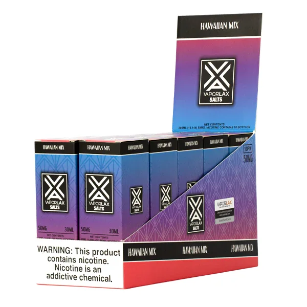 NICOTINE SALTS | PACK OF 10 Flavor : Hawaiian Mix by VaporLax provides puckering sweet taste, made with passion fruit, orange, and guava flavors. A perfectly balanced summertime flavor with a unique fruit mix. E-liquid contents : 30mL Nicotine Strengths : 25mg and 50mg Blended for use with Pod Systems View VaporLax Salt's PMTA Submission Browse more E-Liquid Brands Here