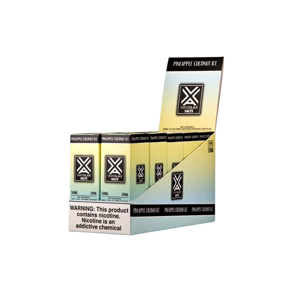 NICOTINE SALTS | PACK OF 10 Flavor Pineapple Coconut Ice by VaporLax Salts mixes up a tropical blend of sweet, Hawaiian pineapple and a light coconut with a cool, refreshing ice. E-liquid contents : 30mL Nicotine Strengths : 25mg and 50mg Blended for use with Pod Systems View VaporLax Salt's PMTA Submission Browse more E-Liquid Brands Here