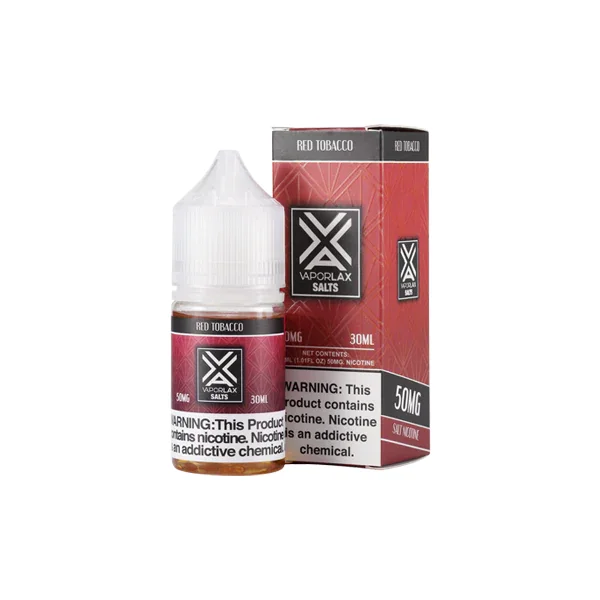NICOTINE SALTS | SINGLE BOTTLE Flavor: The Red Tobacco VaporLax Salt has a classic American tobacco taste. The perfect tobacco salt nic vape juice for vape pod users. E-liquid contents : 30mL Nicotine Strengths : 25mg and 50mg Blended for use with Pod Systems View VaporLax Salt's PMTA Submission Browse more E-Liquid Brands Here