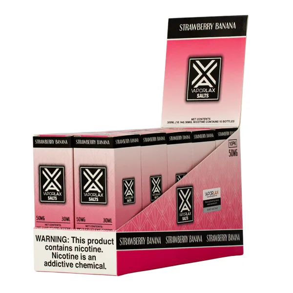 NICOTINE SALTS | PACK OF 10 Flavor : Strawberry Banana by VaporLax is a dreamy blend of succulent strawberries and sweet ripened bananas dancing in your mouth. E-liquid contents : 30mL Nicotine Strengths : 25mg and 50mg Blended for use with Pod Systems View VaporLax Salt's PMTA Submission Browse more E-Liquid Brands Here